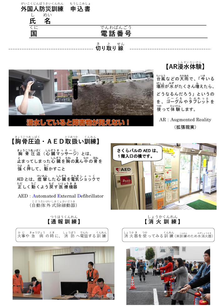 12月21日(日)に「外国人が災害に備えるための訓練」を行います。参加費は無料、ARによる浸水体験もあります。前日(12月20日(土))までにお申し込みください。