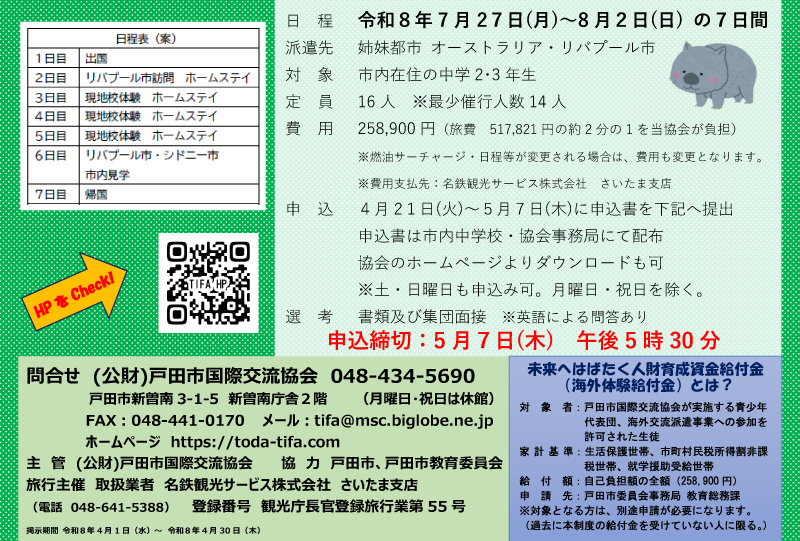 中学生海外交流派遣事業(オーストラリア・リバプール市)を実施いたします。戸田市の姉妹都市であるオーストラリア・リバプール市を訪問し、市内見学や学校体験及びホームステイなど様々なプログラムを体験できます。参加したい人は、参加申込書と志願理由書をご記入の上、受付期間内にTIFAまでご提出ください。